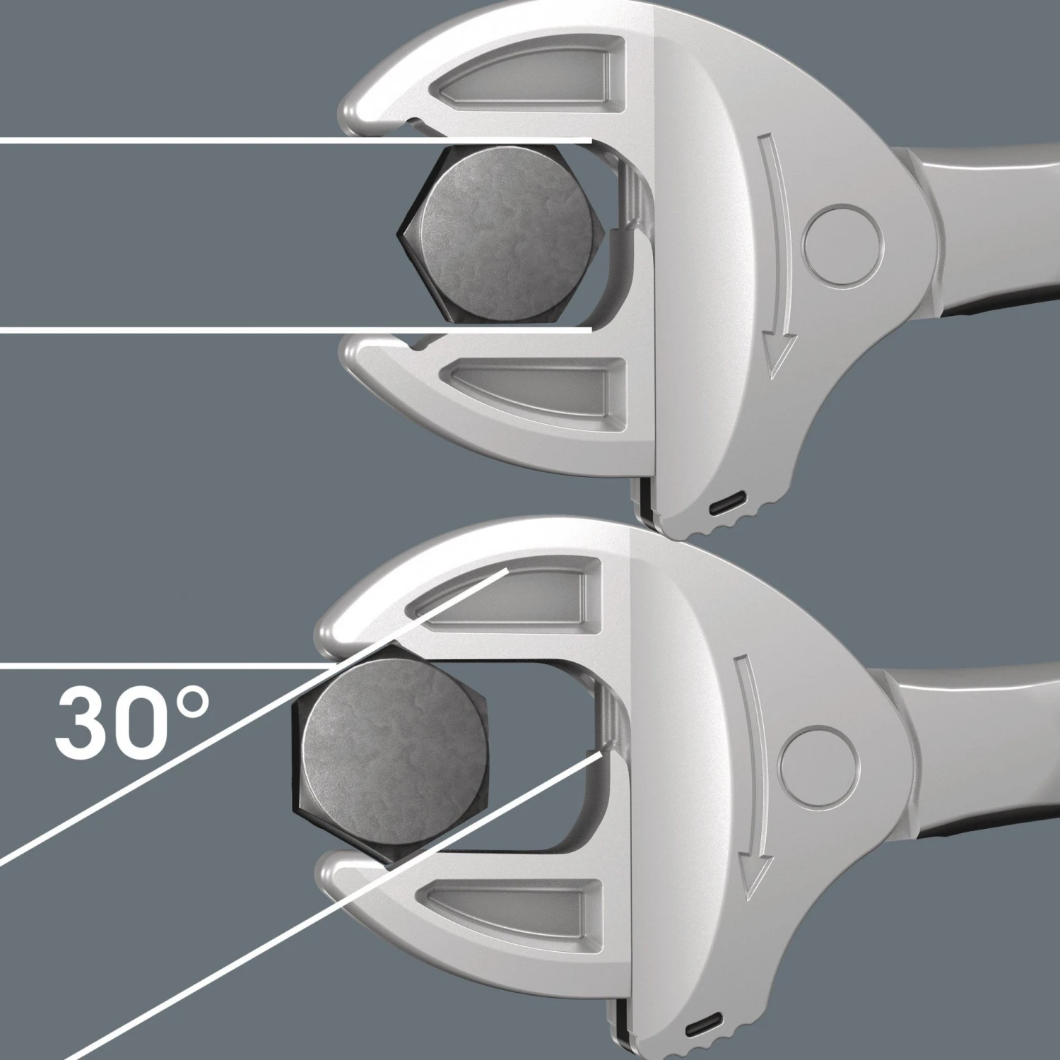 Veel gebruikers zouden graag willen beschikken over een universeel gereedschap dat voor zoveel mogelijk zaken te gebruiken is. Eén stuk gereedschap voor meerdere metrische en duimse maten. En dit zou zich dan ook nog eens automatisch aan de verschillende schroefmaten moeten aanpassen. Veilig vastgrijpen, niets beschadigen en een hoge werksnelheid mogelijk maken. Middels traploos parallel lopende bekken worden meerdere steeksleutelformaten vervangen. De vereiste maat wordt automatisch bij het aanzetten op de zeskant-moer en schroef ingesteld. Het geïntegreerde hefboommechanisme klemt de zeskant-schroef resp. moer tussen de bekken veilig in, hetgeen het risico op wegglijden en beschadigingen aanzienlijk verkleint. De ratelfunctie maak snel en soepel schroeven zonder telkens het gereedschap te moeten verplaatsen mogelijk. Door toepassing van hoekprisma’s wordt een terughaalhoek van slechts 30° gerealiseerd. De 1-zijde-constructie in combinatie met de ratelfunctie en het hoekprisma maakt werken in krappe ruimtes mogelijk. De instelbare Joker 6004 is een echt universeel schroefgereedschap. Zelfinstellend. Vastgrijpend. Ratelend.
